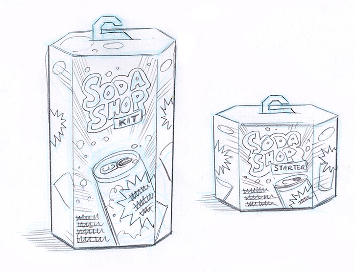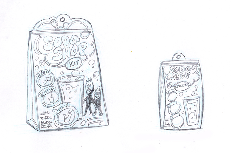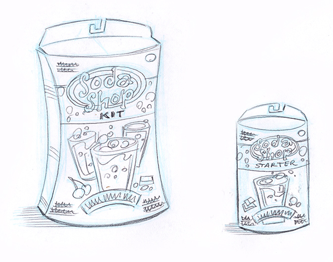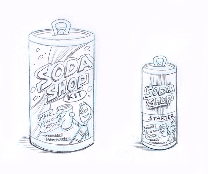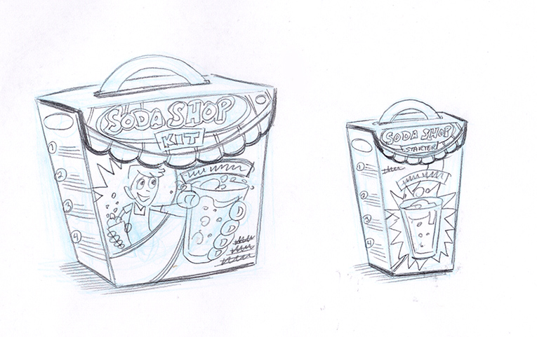These concepts were for a Arts & Crafts company (which will rename nameless) that was considering doing some kid’s science kits for making soda. Sounds like fun. These sketches were fun, but alas this project died before it had a chance to give any overzealous kid a bellyache.